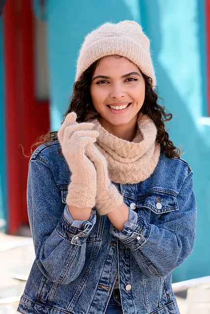 This pattern includes the instructions for the Cowl, Gloves, and Beanie.