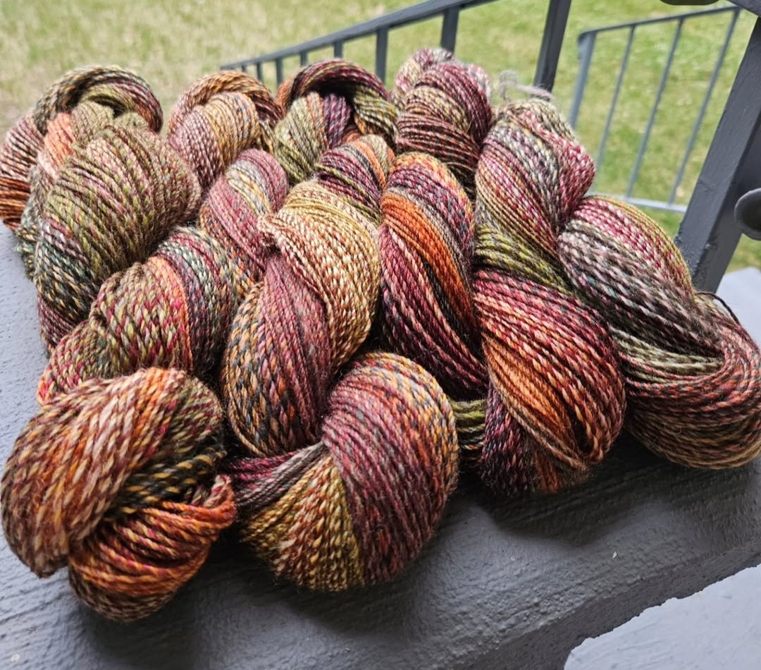 The class is a two-session class. In the first class you'll learn about worsted, woolen, and long draft spinning. We'll also cover the first step of fractal spinning. The second class covers plying your fractal spinning, adding embellishments as you ply, and differences between 2-ply, chain-ply, and 3-ply.