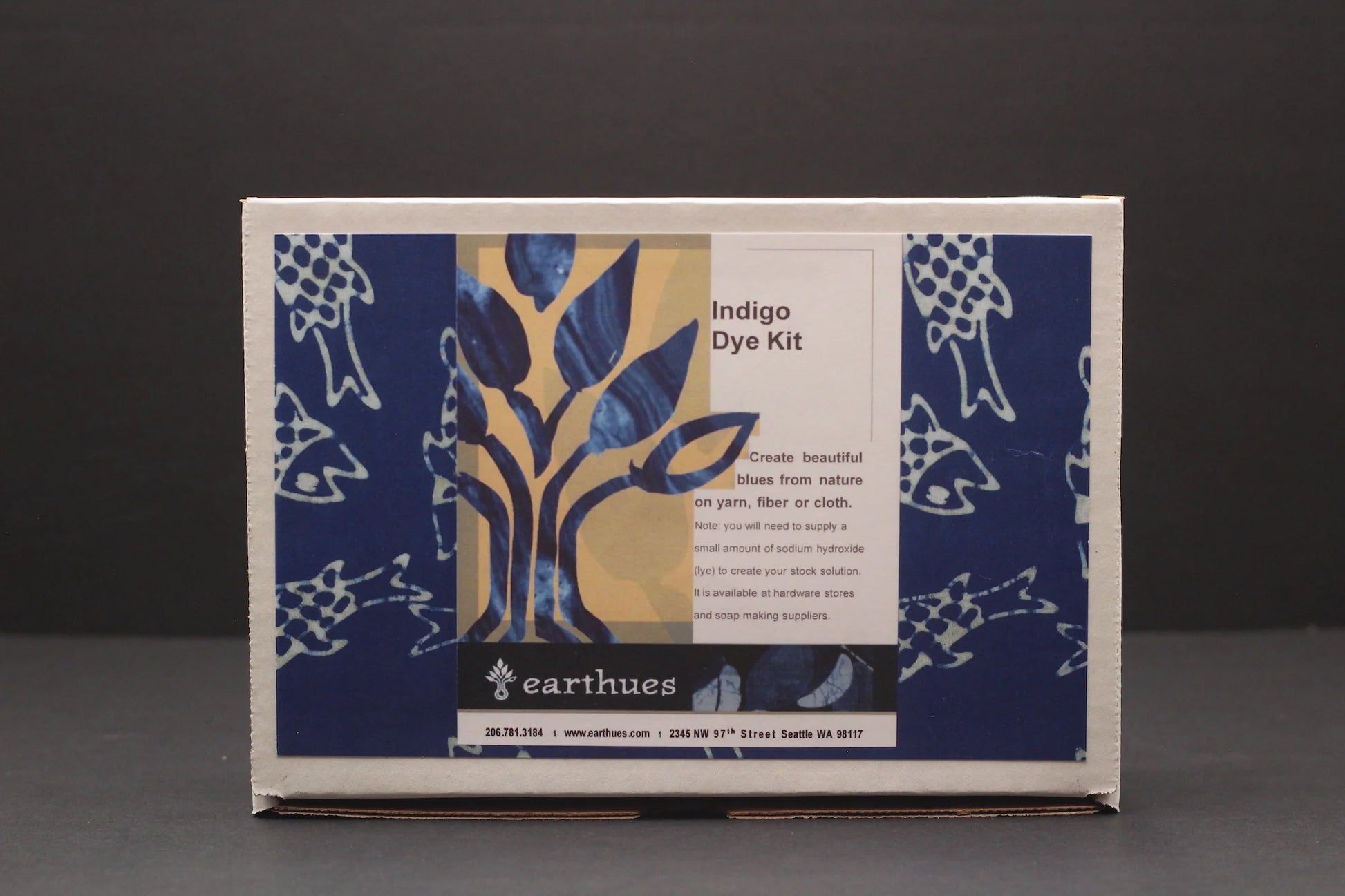 Our kit contains indigo, thiourea dioxide, sodium hydroxide lye. soda ash hide glue, 10 pH indicator strips, instruction booklet, dust mask & gloves.