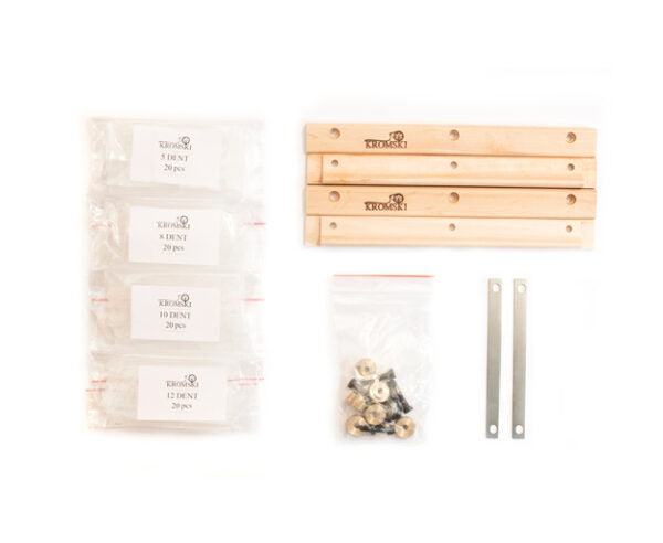 - 4 wooden pieces – per size: Two of them are flat on one side with the Kromski logo stamp. The other side has a “shelf”. The other two are flat on one side with no logo and curved on the other side.